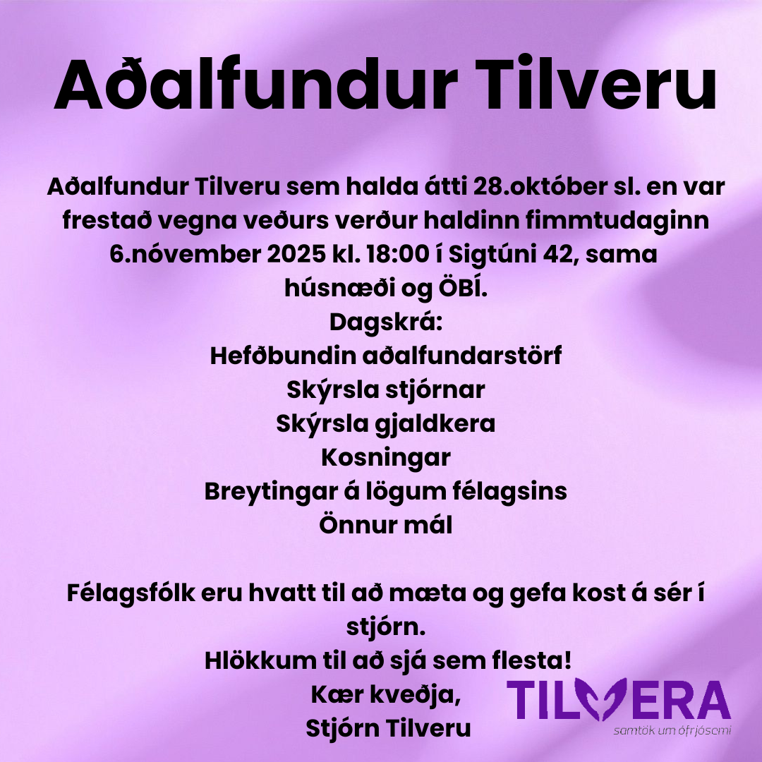 Aðalfundur Tilveru sem halda átti 28.október sl. en var frestað vegna veðurs verður haldinn fimmtudaginn